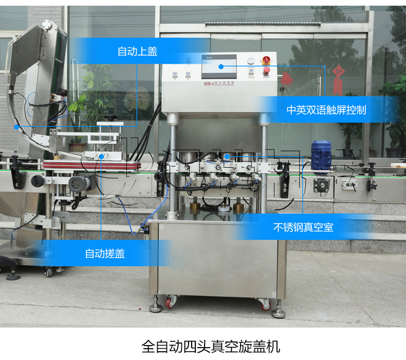 該生產(chǎn)線(xiàn)適合中小口徑三旋、四旋玻璃瓶調(diào)味醬的分裝,適合醬料、含顆粒黏稠物料的灌裝,物料接觸部分均采用316不銹鋼,整機(jī)304不銹鋼,符合食品衛(wèi)生標(biāo)準(zhǔn)。該機(jī)設(shè)計(jì)合理,機(jī)型小巧,立式結(jié)構(gòu),節(jié)省場(chǎng)地,操作方便。啟動(dòng)部分均采用FESTO和臺(tái)灣AirTack的氣動(dòng)元件。灌裝閥有氣動(dòng)閥控制,灌裝精度更高,灌裝量和灌裝速度均可任意調(diào)整,灌裝悶頭采用防拉絲及升降灌裝裝置。