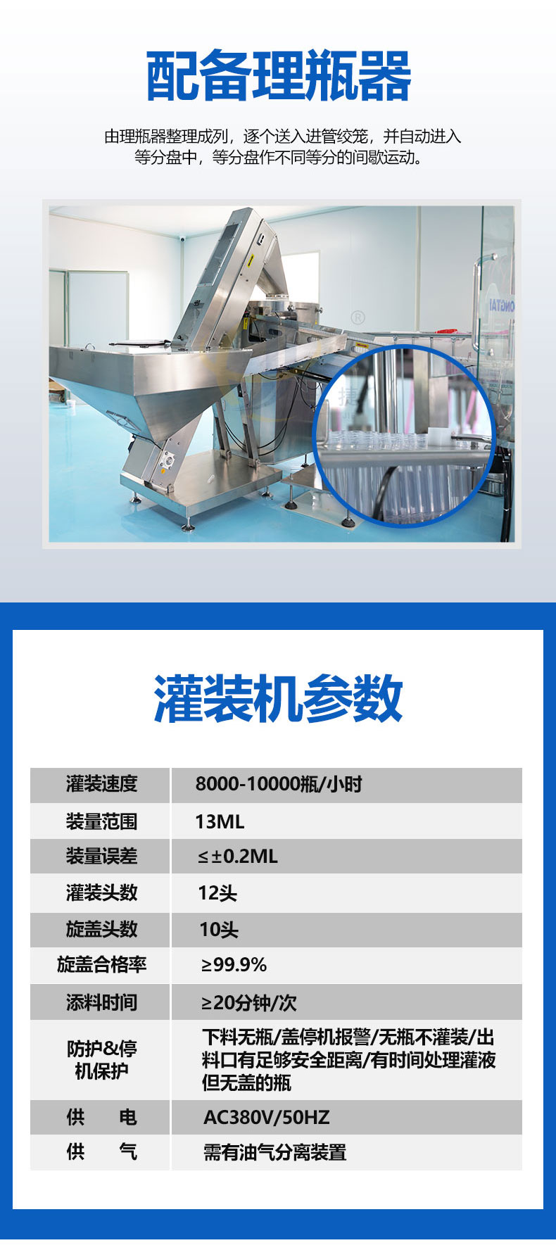 全自動(dòng)診斷試劑灌裝旋蓋生產(chǎn)線由理瓶器整理成列,逐個(gè)送入進(jìn)管絞龍,并自動(dòng)進(jìn)入等分盤中,等分盤作不同等分的間歇運(yùn)動(dòng)。