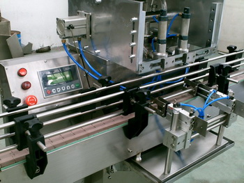 本機(jī)與物料接觸均為不銹鋼制作,完全符合GMP標(biāo)準(zhǔn)。快速活接連接,拆洗方便,灌裝量、灌裝速度均可調(diào)節(jié),更 換不同規(guī)格形狀的瓶子,不需更換零件,調(diào)整容易。另灌裝頭設(shè)有防滴漏裝置,灌裝無拉絲、滴漏;有瓶灌裝、無瓶不灌裝;設(shè)有計數(shù)功能,能準(zhǔn)確顯示當(dāng)前產(chǎn)量、 前班產(chǎn)量;并備有自動加料控制接口,實(shí)現(xiàn)對加料的自動控制。各動作平穩(wěn)、準(zhǔn)確無誤,是目前較為理想的機(jī)電氣一體化產(chǎn)品。(該設(shè)備需要配備輔助設(shè)備:真空泵,真空儲氣罐)